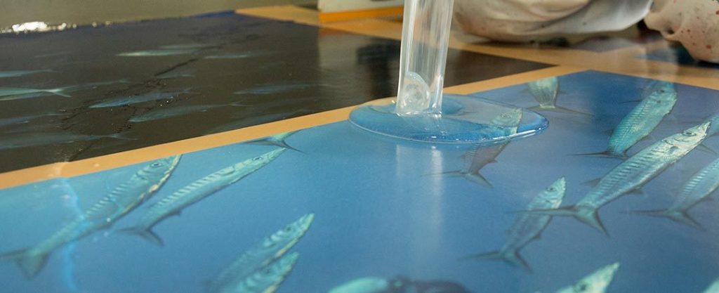 Resina epóxica de dos componentes 100% sólidos que se utiliza como protector y acabado transparente sobre panorámicas y diseños decorativos previos.